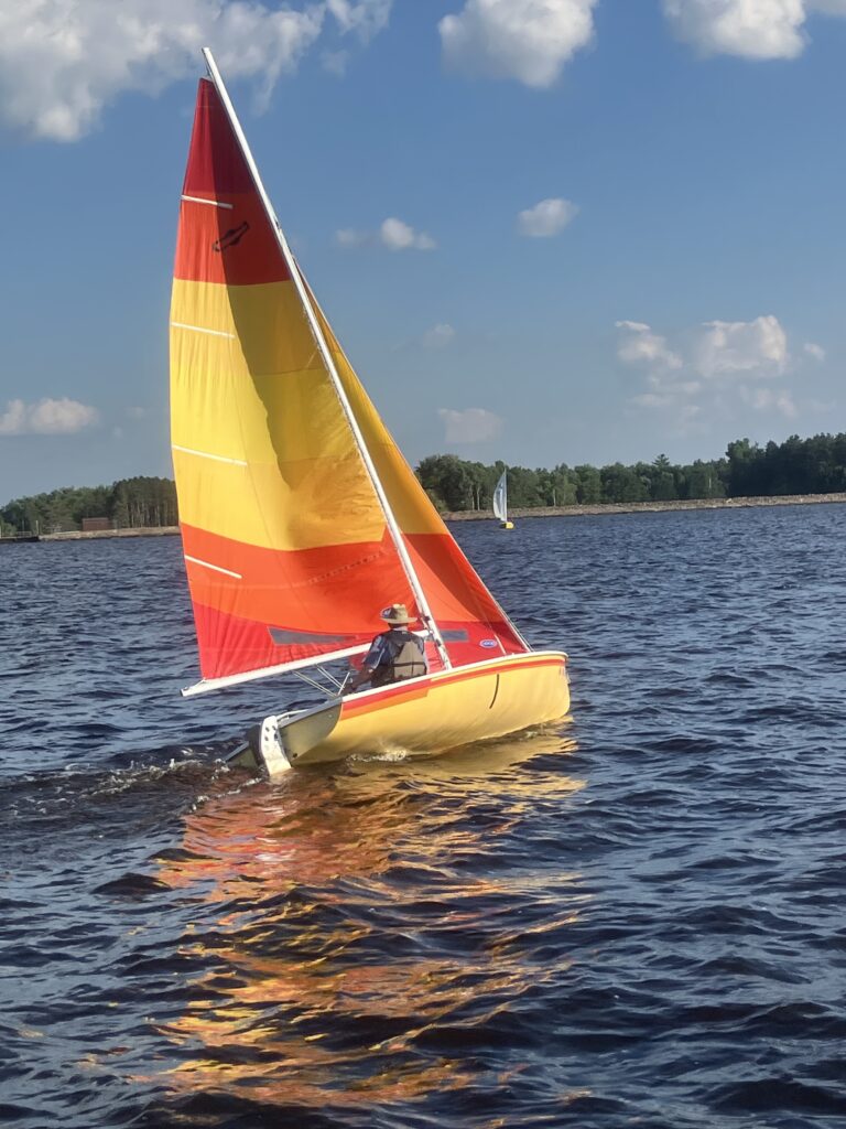 I was more focused on the other MC Scow on the course, skippered by Joe Terry. Joe helped me out by walking over the top of me on the windward leg of the first race. What a discouraging feeling to hear the chop, chop, chop of his bow getting closer and closer as we worked up the leg on port. Even worse as he passed me and took my wind. But then I noticed that his boom was sitting out over the corner of his transom, while mine was sheeted near the centerline. Once I eased my sheet like Joe, I immediately picked up speed. In retrospect this made sense as In light air, the air flow over the water is laminar, and the speed of the wind over the water changes with height. Because our boats sail on the apparent wind, this means the wind flow at the top of the sail hits the sail at a different angle than it does the bottom. Thus, you need to have twist in your sail to match the twist of the apparent wind. This changes as the wind increases and turbulence mixes the high and low wind together. At that point, twist becomes undesirable (unless you are trying to depower your boat in heavy air). Leech tell tales are probably the best way to tell if your sail twist matches the apparent wind. If all of your leech tell tales are periodically streaming, you are probably in the right ballpark for mainsheet trim.